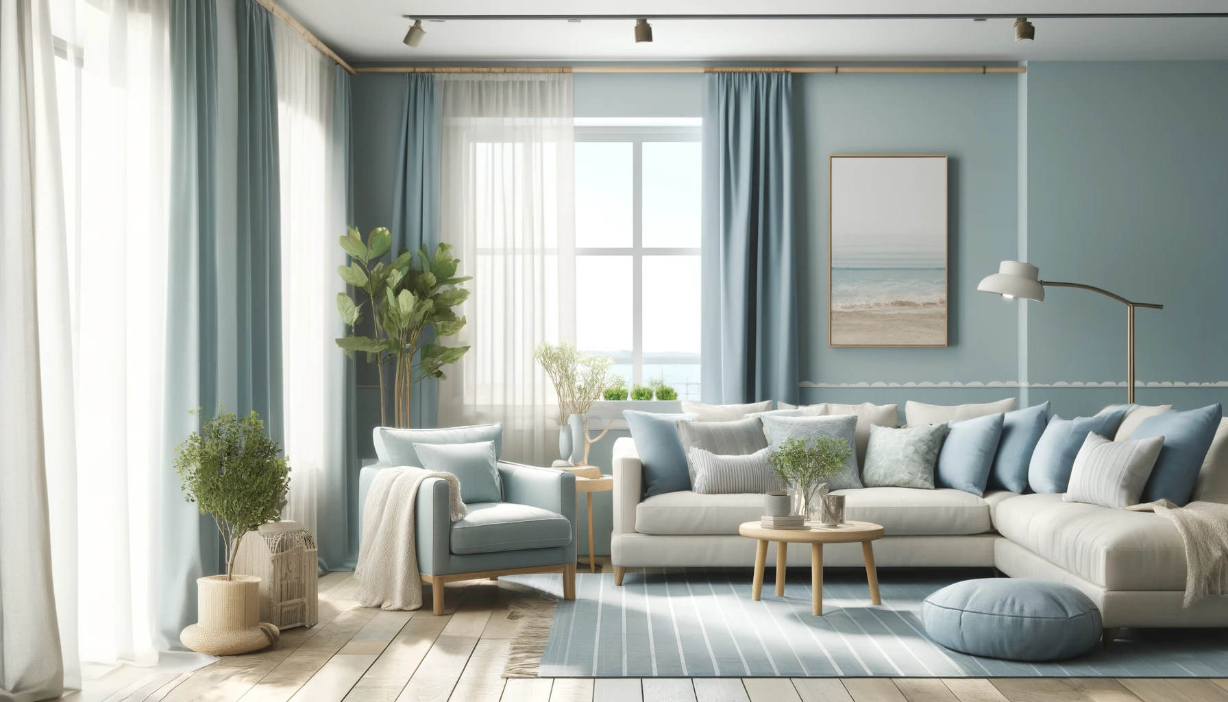 여름: 시원한 느낌을 주는 블루 계열의 소품, 린넨이나 코튼 소재의 커튼과 쿠션 등을 사용해 청량한 분위기를 연출합니다.